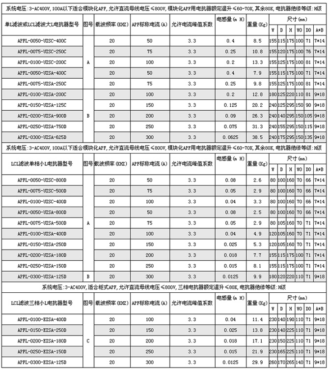 6脉冲滤波APF(10KHZ)连接电抗器技术参数: